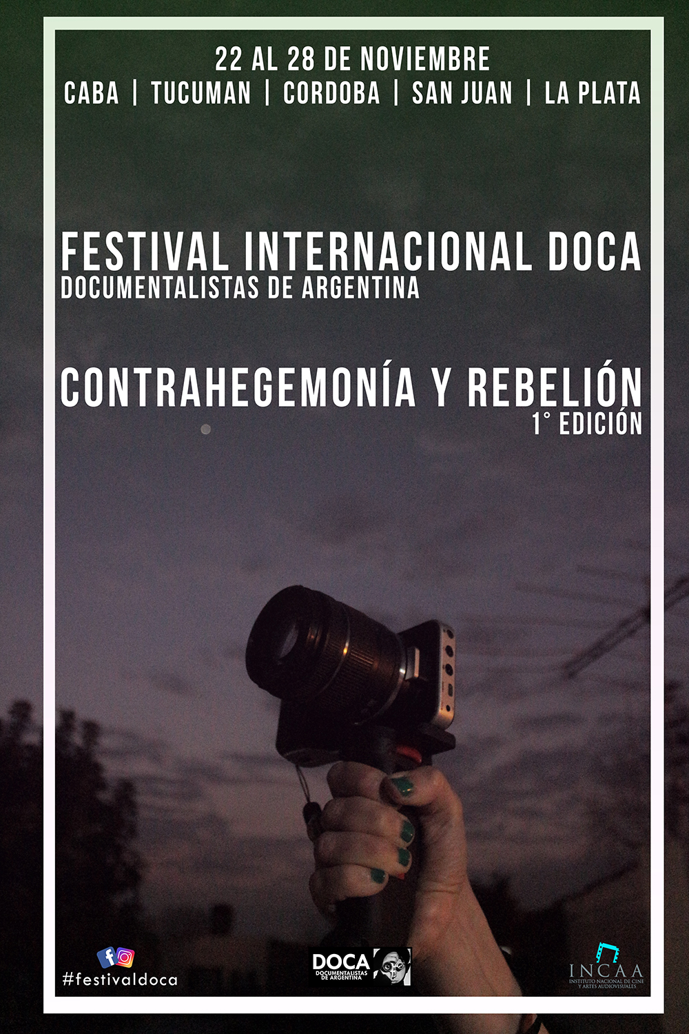 Nuestra Asociación de Documentalistas de Argentina, DOCA, celebra11 años lanzando en cinco sedes el primer Festival Internacional de Largometrajes Documentales. Festejamos las inscripción de más de 700 films, de los cuales han quedado 25 películas seleccionadas que se proyectarán en la Ciudad Autónoma de Buenos Aires, Córdoba, La Plata, San Juan y Tucumán, del 22 al 28 de noviembre.